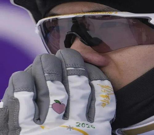 2月20日,王心迪在比赛后庆祝夺冠,双手戴着一“桃”一“心”。图源:新华社