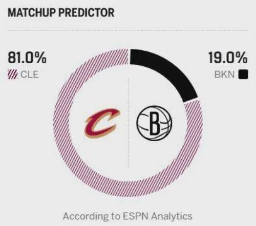 今日一战,骑士的新核哈登迎来复出,米切尔将继续缺阵。即便少了一位核心,骑士还有阿伦与莫布里的双塔坐镇,实力依旧占据明显上风。不出意外,骑士有望在客场轻松拿下比赛,终结连败颓势。赛前,ESPN给出本场胜率预测,骑士高达81%,篮网只有19%。