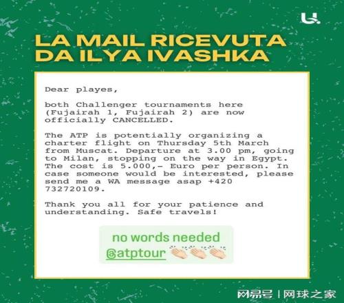 外媒此前报道,由于阿联酋富吉拉挑战赛意外被取消,为了让球员和相关随行人员安全离开中东,ATP准备包机从马斯喀特起飞,经停埃及后前往米兰。