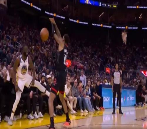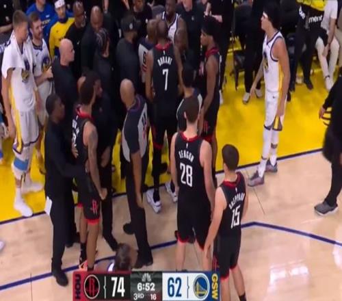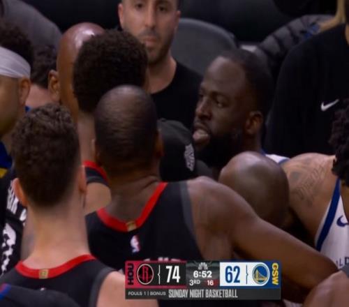 在第三节比赛进行到中段时刻,追梦格林接球后被小贾巴里-史密斯犯规,结果追梦格林先是用球砸向站在他面前的小贾巴里-史密斯,随后还主动走上去撞小贾巴里-史密斯的肩部。两人随即发生肢体纠缠与口角冲突,双方球员也是围拢上去制止事态进一步发展。